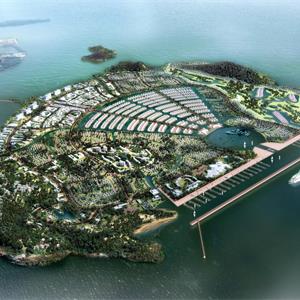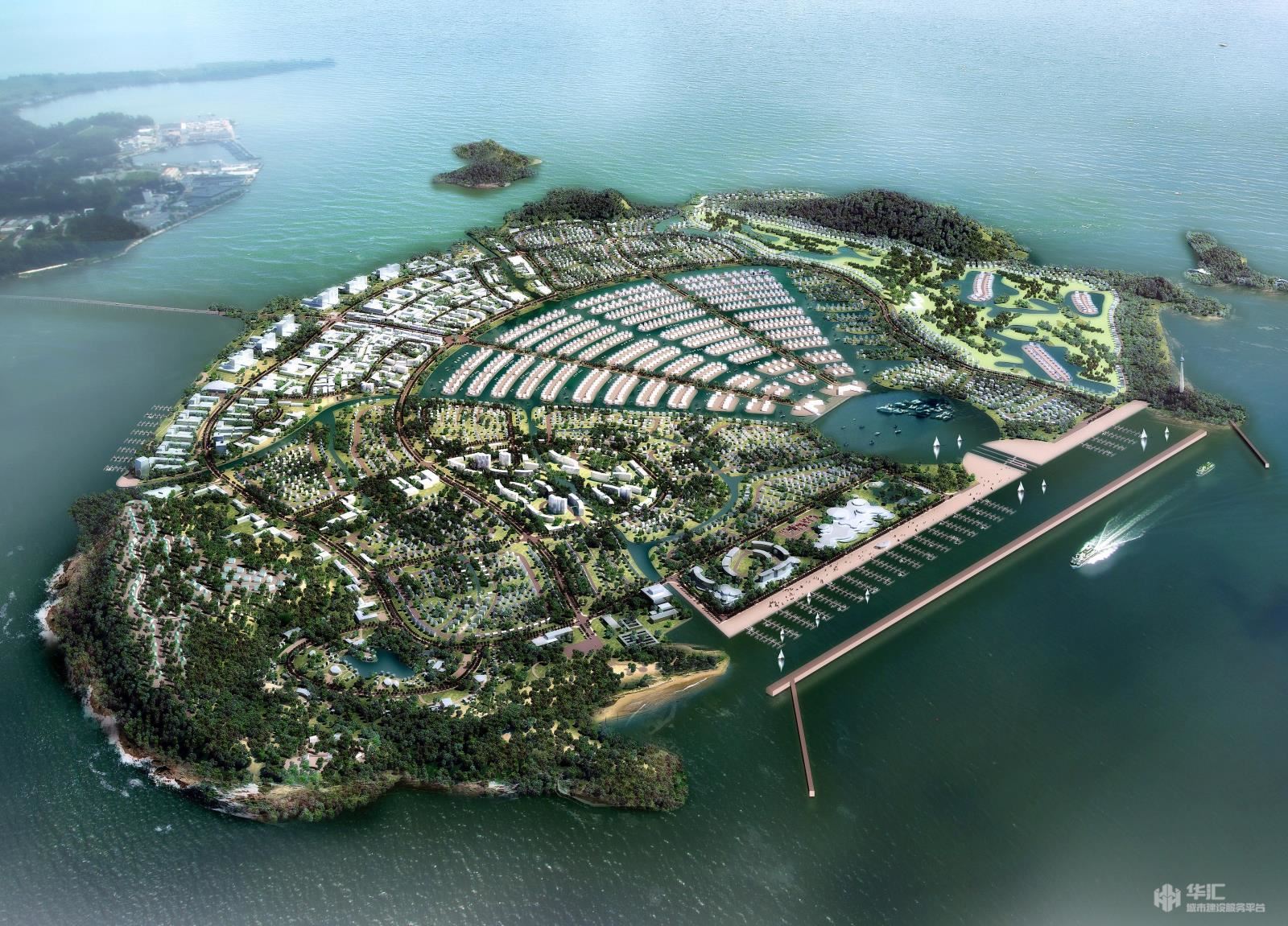 项目概况:打造世界级度假海岛,进行的围海造岛。以三条轴线(繁华、环境、向心)串联起六大功能区。入口区∶在岛屿的入口附近集中设置游客设施(涵盖住宿、商业设施、娱乐设施等),海滨别墅区∶在面向中央圆形水池的场所设置高级游艇别墅,港湾区∶面向外海可以停泊客船。山地高级住宅区∶背依羊背山,鳞次而建。水绿相间的住宅区∶在靠近本岛宽广的围垦地内形成自然景观良好的住宅区。高尔夫球场区∶在太平岗、青门山等山麓建设。