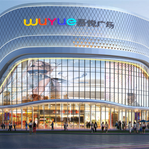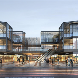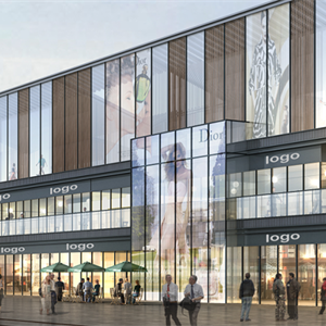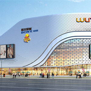 购物中心立面:现代风格立面,以金属幕墙和玻璃幕墙为主。运用体块穿插的手法,不同的材料、颜色合理分布和搭配,使得立面简洁大气、富有趣味。建筑的使用功能是我们设计外立面的前提条件。在考虑建筑立面美观的同时,仔细推敲建筑造型和功能之间的关系,做到满足建筑内部功能的具体需求,封闭与开放分布合理。商业建筑设计的外立面需要考虑大量的广告展示及多媒体展示功能,因此造型设计是结合各级广告位统一考虑的,这样使得广告位与整个建筑融为一体,让广告元素丰富建筑立面和增加商业氛围。